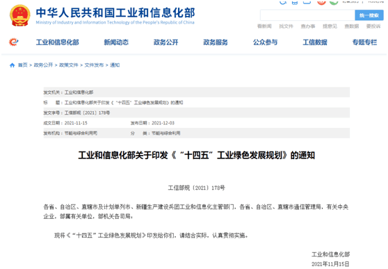 工业和信息化部近日印发了《“十四五”工业绿色发展规划》(工信部规〔2021〕178号,以下简称《规划》)。