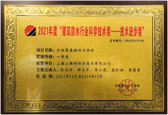 2021年,三棵树防水聚焦对聚氨酯防水涂料的升级改造。三棵树防水研发团队除了利用可再生能源,将植物基环保增塑剂引入聚氨酯防水涂料推出SGW230绿意净味植物油聚氨酯防水涂料外,还在聚氨酯防水涂料“水性化”技术的研究与开拓中取得了创新性突破。SGW8100绿意清味水性超耐久聚氨酯防水涂料的面世,不仅丰富了三棵树“健康家族”环保型防水涂料体系,更是开启建筑防水行业“水性化”新时代。该项目荣膺被誉为建筑防水行业技术“奥斯卡”奖的“建筑防水行业科技技术奖——技术进步奖”一等奖。