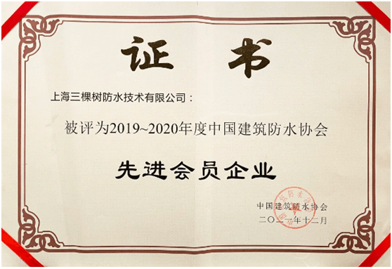 自成立以来,三棵树防水一直秉承着“为建筑赋能,让建筑更美好”的企业使命,积极履行企业社会责任,推动防水行业健康发展。经协会评审,三棵树防水荣获2019年-2020年度先进会员企业。