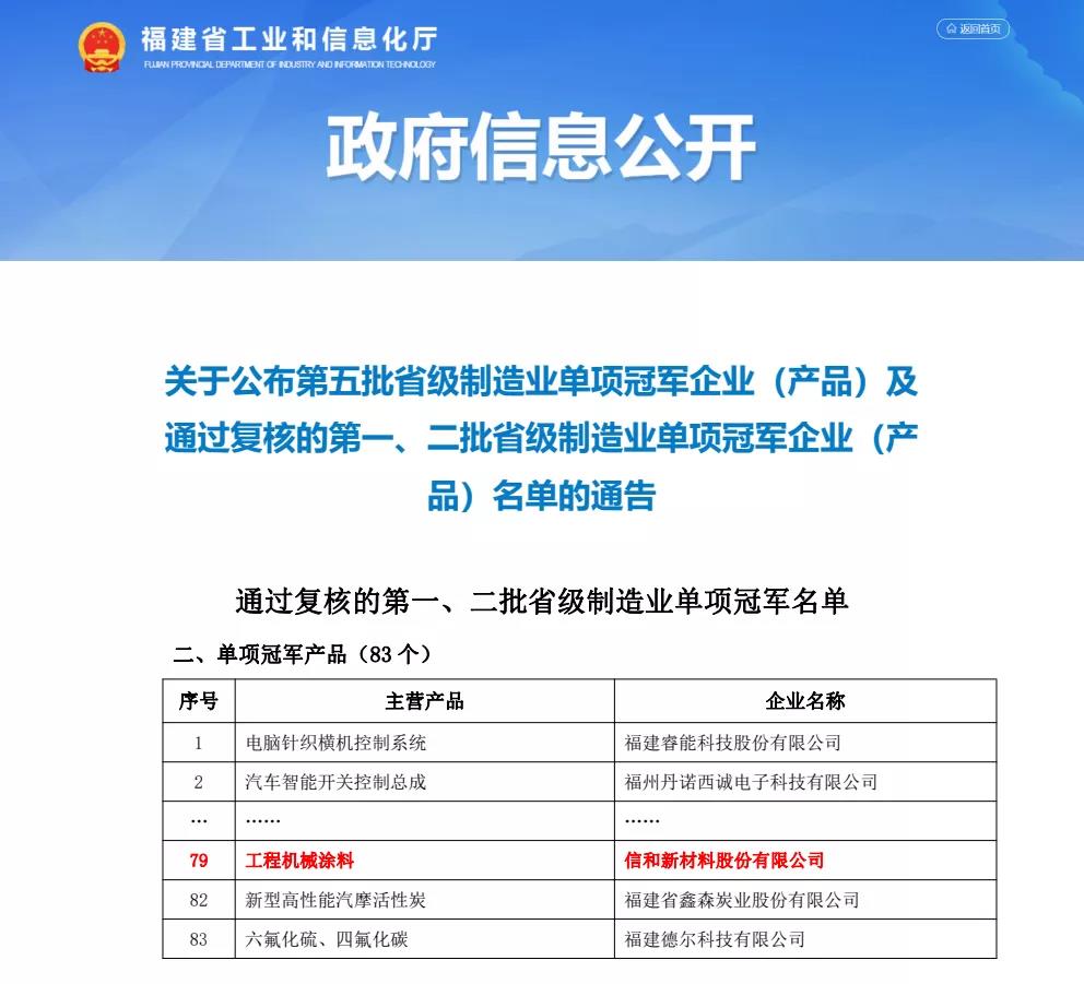 近日,福建省工业和信息化厅正式公示了关于公布第五批省级制造业单项冠军企业(产品)及通过复核的第一、二批省级制造业单项冠军企业(产品)名单的通告,信和新材凭借工程机械涂料的引领优势和技术创新优势,获评“省级制造业单项冠军产品”称号。