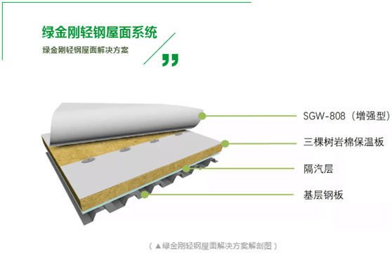 新建工业厂房中钢结构居多,而传统钢结构以自防水钢瓦屋面作为主流。经过多年的市场应用验证,自防水钢瓦屋面容易出现锈蚀、穿孔、抗风差、重量大、维护困难等问题。因此,三棵树推出由压型钢板、隔汽层、保温层、防水层构成的绿金刚轻钢屋面系统。整个系统重量轻、抗风强、暴露在外的防水层维护便捷。同时可与屋面天窗、风机、排水沟等凸起构件完美兼容,具备良好的扩展性能。铺设完成后呈浅色屋面,反射比率较高,形成冷屋面效果,相较传统“黑顶”屋面具备更好的建筑节能效果。