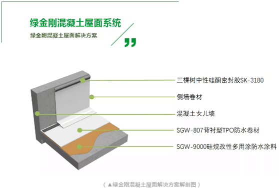 对于混凝土结构工业厂房,仅依靠混凝土自防水是远不足够的。三棵树防水推出SGW807背衬型TPO防水卷材配合SGW9000绿意清味硅烷改性防水涂料的“涂卷复合系统”,为混凝土屋面构建双重防水层。该解决方案可以直接外露,无需保护层,易维护。同时具备耐-40℃低温特性,尤其适合寒冷地区使用。