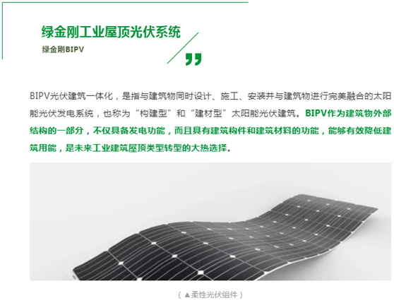 绿金刚BIPV工业屋顶光伏系统中的柔性光伏组件具备塑性好、适应结构变形能⼒强的特点,更适宜安装在单层屋面系统中。组件仅需通过简单地放线后,利用背部自粘胶粘贴于使用TPO高分子防水卷材的屋面基层即可,施工简便快速。