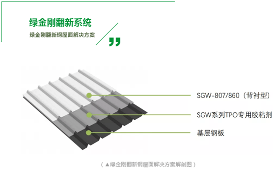 国内现有轻钢工业厂房的防水方式多以钢瓦自防水为主。随着使用时间的延长,建筑主体出现锈蚀引发渗漏水的情况已令钢瓦建筑失去原有防水功能。绿金刚翻新系统通过SGW系列专用胶粘剂将TPO高分子防水卷材满粘于基层上。老旧钢瓦屋面在防水修缮过程中不仅无需拆除屋面组件,而且施工简单快捷,让屋面焕发新春。