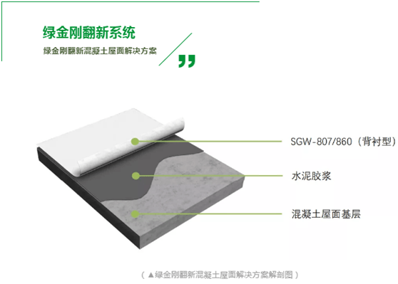 针对老旧混凝土屋面,修复基层裂缝,是从根源上杜绝渗漏的最佳方式之一。因此,绿金刚翻新系统使用水泥胶浆加以TPO高分子防水卷材的“涂卷复合系统”,实现对老旧混凝土屋面的高效快速修缮。