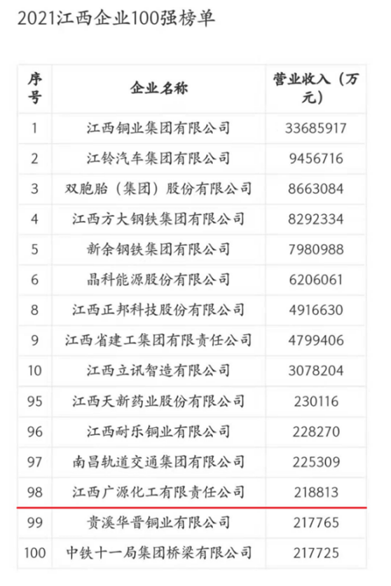 近日,江西省企业联合会、江西省企业家协会举行了2021江西企业100强新闻发布会。会上发布了江西100强榜单,江西广源以21.8亿元的营业收入首次进入百强企业榜单,位列98位。