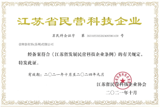 近日,江苏省民营科技企业协会公布了2021年第三批江苏省民营科技企业认证名单,信和新材料(苏州)有限公司通过各项资质认证,被认定为“江苏省民营科技企业”荣誉称号。