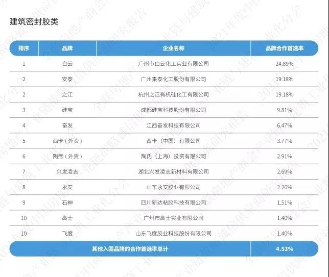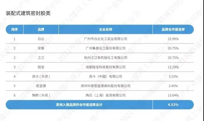 根据《报告》显示,集泰股份旗下品牌安泰分别以19.18%、20.75%再次蝉联建筑密封胶类、装配式建筑密封胶类品牌合作首选率前三甲,凸显了市场主导地位。