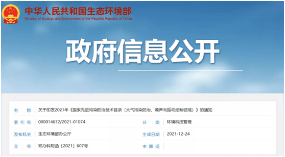 12月22日,生态环境部办公厅印发《关于印发2021年<国家先进污染防治技术目录(大气污染防治、噪声与振动控制领域)>的通知》(环办科财函〔2021〕607号)(以下简称《通知》)。