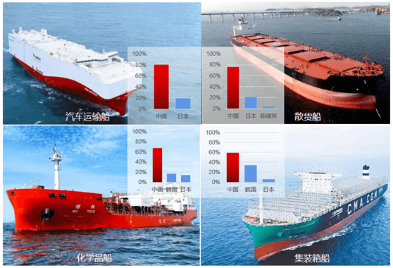 除在总量上继续保持领先外,中国造船企业在各细分船型市场上持续发力,18个主要船型中,中国获得10个船型的市场份额第一,其中在集装箱船、散货船、化学品船、多用途船(MPP)、海工船、汽车运输船(PCC/PCTC)等船型的市场份额超过50%(绝对优势),产品结构大幅优化,高技术、高附加值主力船型不断涌现。代表造船工业皇冠上三颗“明珠”的大型LNG运输船、航母和大型邮轮,都正在全面突破。超大型集装箱船、新一代的17.4万立方米LNG运输船、大型汽车运输船(PCTC)、智能型船舶、浮式液化天然气设施(FLNG)、第六代半潜式钻井平台等一系列高端船舶及海工装备已经成为我国船舶工业出口的名片。