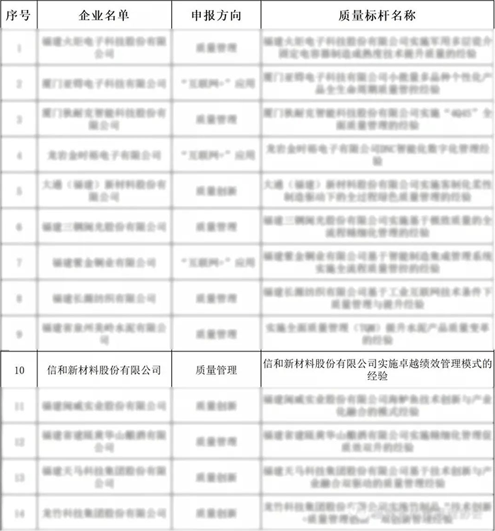 根据《福建省工业和信息化厅关于开展2021年质量标杆活动的通知》(闽工信函科技〔2021〕434号)要求,经企业自愿申请、有关单位推荐和专家评审等程序,全省共有14家企业通过评审,其中信和新材料股份有限公司(以下简称“信和”)实施卓越绩效管理模式的经验被认定为2021年省级质量标杆。