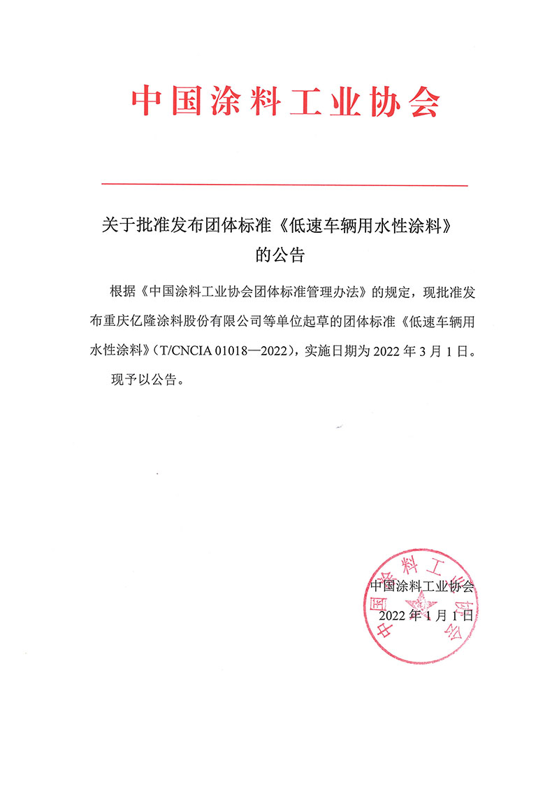 根据《best365中国官方网站团体标准管理办法》的规定,现批准发布重庆亿隆涂料股份有限公司等单位起草的团体标准《低速车辆用水性涂料》(T/CNCIA 01018—2022),实施日期为2022年3月1日。