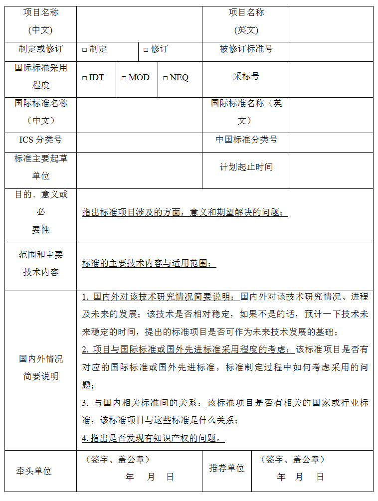 1、凡提出的立项项目,推荐单位或个人应进行充分调研,并按规定的内容和要求,填写《团体标准项目建议书》(附件1)。