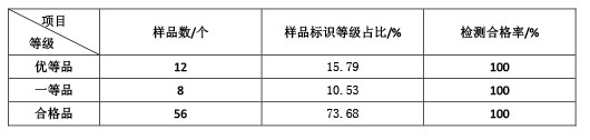 对共计38个市场品牌合计76个样品检测后,抽检样品均达到商品标识等级质量要求。其中,部分品牌产品各检测项目优于国标中相应等级产品质量要求,例如,一等品部分有2个品牌对比率优于国标一等品要求,合格品部分有4个品牌对比率达到国标中优等品要求,7个品牌对比率达到国标一等品要求,7个品牌对比率优于国标合格品要求。详细检测信息汇总见附件1。