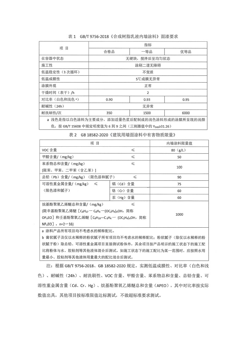 注:根据GB/T 9756—2018、GB 18582—2020规定,实测低温成膜性、对比率(白色和浅色)、耐碱性(24 h)、耐洗刷性、VOC含量、甲醛含量、苯系物总和含量、总铅含量、可溶性重金属含量(Cd、Cr、Hg)、烷基酚聚氧乙烯醚总和含量(APEO),其中对比率按实际数值出具,其他项目按标准限值达标测试,不做超标准要求测试。