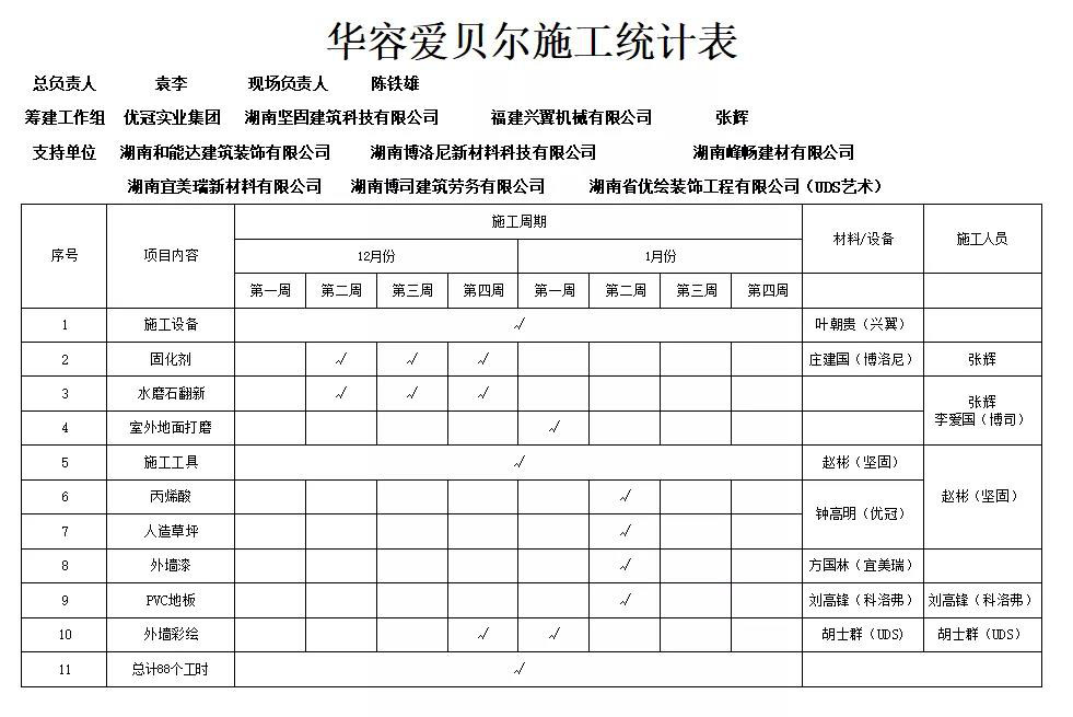 地坪分会秘书处在理事会的支持下,特别是地坪分会副秘书长袁李先生、湖南省地板行业协会地坪分会执行会长张辉先生自始至终主导协调并参与实施该项目,多次亲临项目施工现场指导并跟进工程进度。本项目还得到了湖南省政协委员、中涂协地坪分会副理事长、湖南优冠实业集团董事长钟高明先生的鼎力支持,同时湖南省地板行业协会地坪分会携手多家爱心企业、爱心人士积极参与,出钱出力,辛勤付出,共募集价值50多万元的款物并耗费300多个人工,使项目圆满顺利落成。