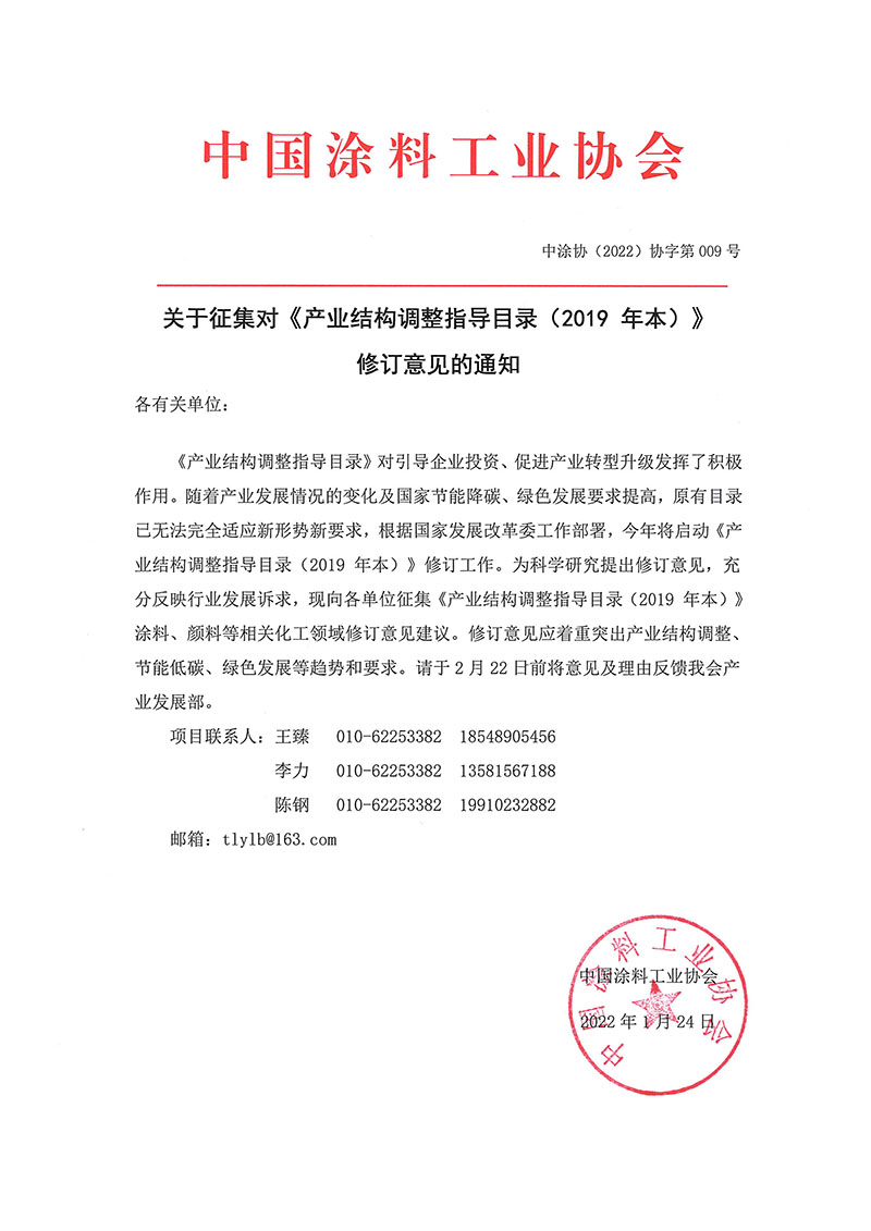 《产业结构调整指导目录》对引导企业投资、促进产业转型升级发挥了积极作用。随着产业发展情况的变化及国家节能降碳、绿色发展要求提高,原有目录已无法完全适应新形势新要求,根据国家发展改革委工作部署,今年将启动《产业结构调整指导目录(2019 年本)》修订工作。为科学研究提出修订意见,充分反映行业发展诉求,现向各单位征集《产业结构调整指导目录(2019 年本)》涂料、颜料等相关化工领域修订意见建议。修订意见应着重突出产业结构调整、节能低碳、绿色发展等趋势和要求。请于2月22日前将意见及理由反馈我会产业发展部。
