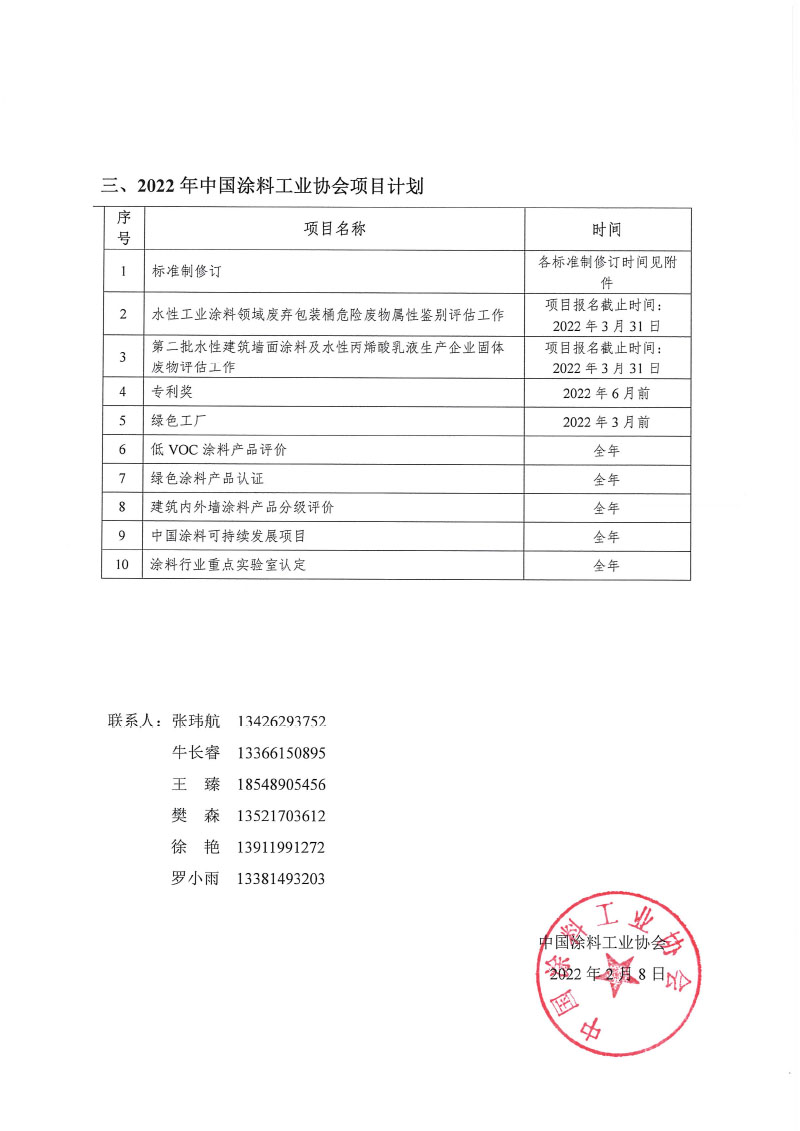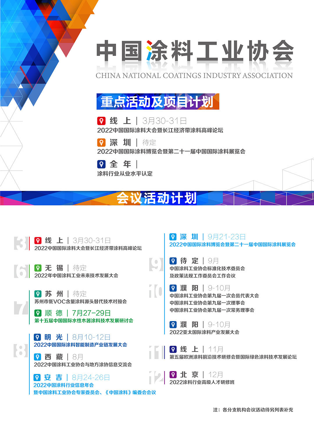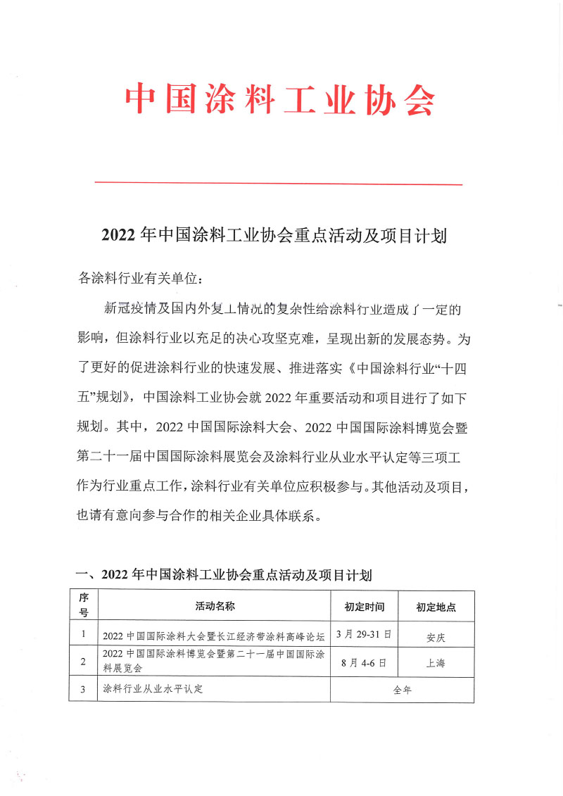 新冠疫情及国内外复工情况的复杂性给涂料行业造成了一定的影响,但涂料行业以充足的决心攻坚克难,呈现出新的发展态势。为了更好的促进涂料行业的快速发展、推进落实《中国涂料行业“十四五”规划》,best365中国官方网站就2022年重要活动和项目进行了如下规划。其中,2022中国国际涂料大会、2022中国国际涂料博览会暨第二十一届中国国际涂料展览会及涂料行业从业水平认定等三项工作为行业重点工作,涂料行业有关单位应积极参与。其他活动及项目,也请有意向参与合作的相关企业具体联系。