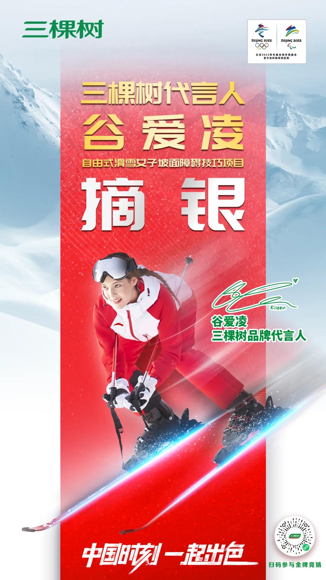 2月15日,在北京2022年冬奥会自由式滑雪女子坡面障碍技巧决赛中,三棵树品牌代言人谷爱凌以86.23分获得1枚银牌,再创佳绩。这也是她在本届冬奥会的第二枚奖牌了。