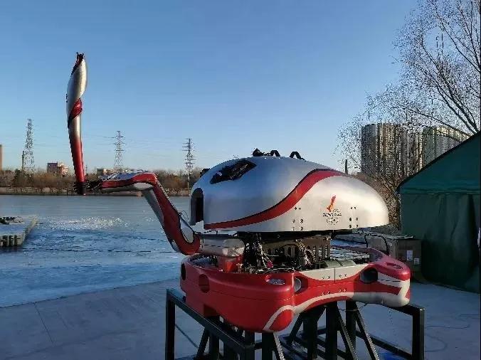 在此次接力活动中,火炬手将奥运圣火传递给一台水陆两栖机器人,机器人接过燃烧火炬,沿冰壶赛道旋转滑入冰洞口,同时,另一台水下变结构机器人向其靠拢。随后,两台机器人在水下精准对接点火,水下变结构机器人手持点燃火炬从冰洞口出水,将奥运圣火传递给下一棒火炬手。