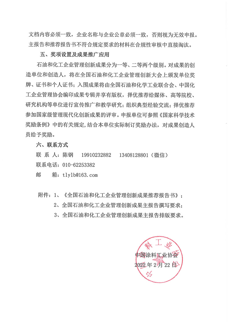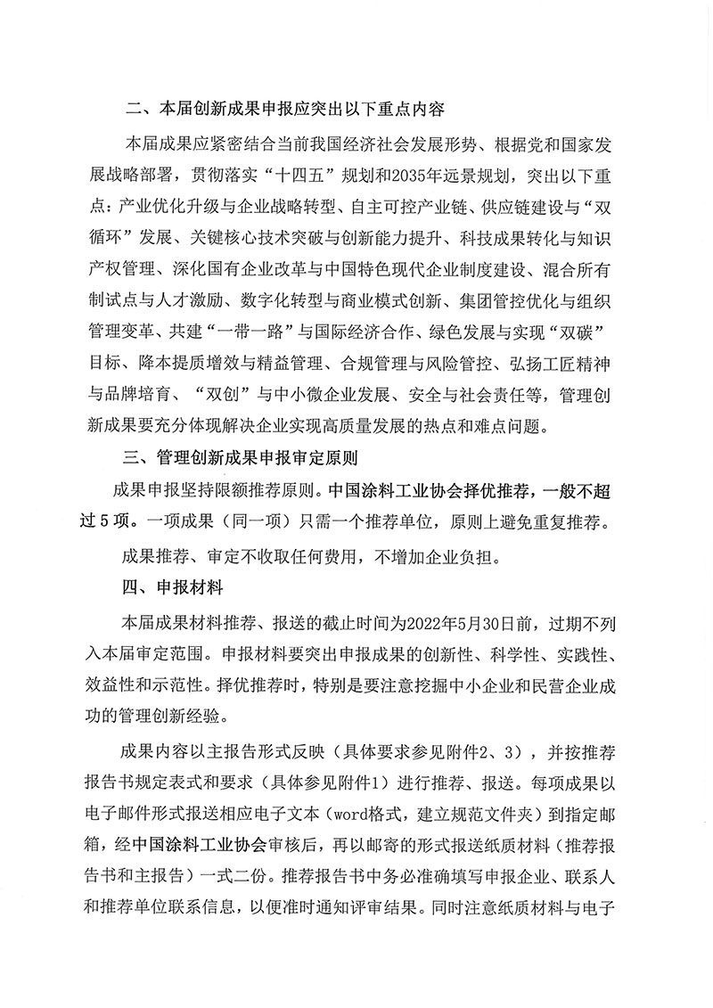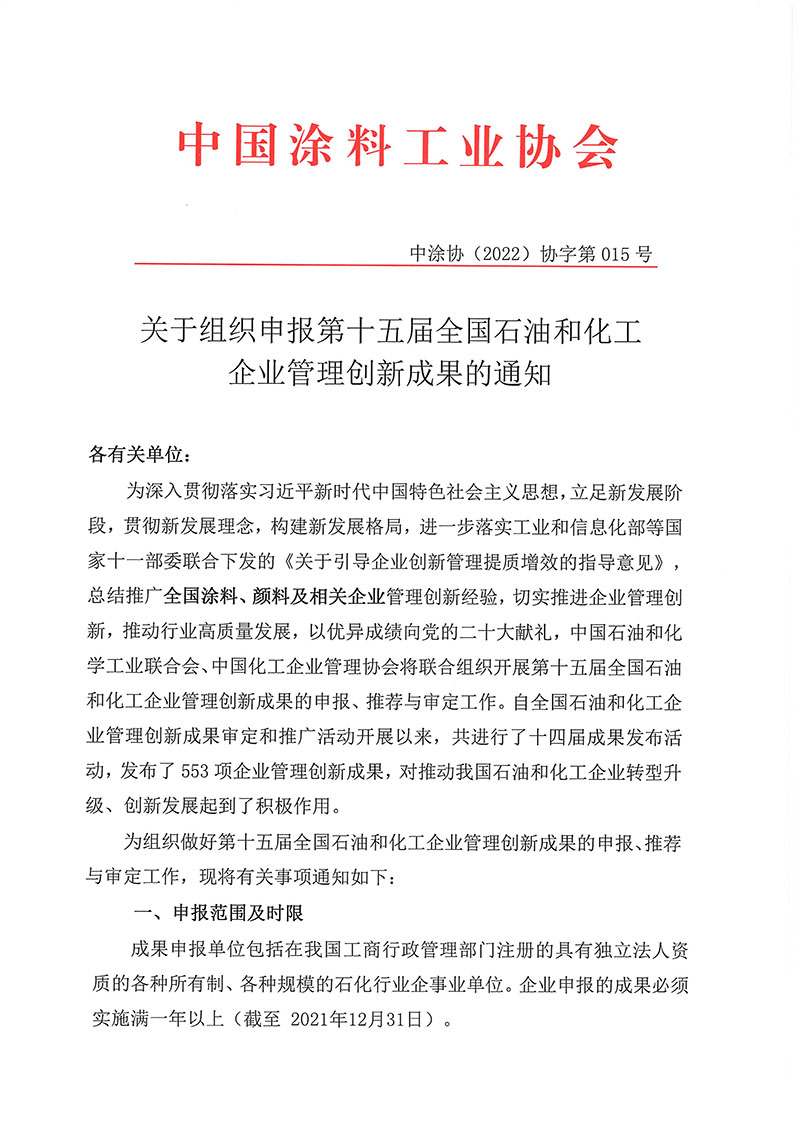 为深入贯彻落实习近平新时代中国特色社会主义思想,立足新发展阶段,贯彻新发展理念,构建新发展格局,进一步落实工业和信息化部等国家十一部委联合下发的《关于引导企业创新管理提质增效的指导意见》,总结推广全国涂料、颜料及相关企业管理创新经验,切实推进企业管理创新,推动行业高质量发展,以优异成绩向党的二十大献礼,中国石油和化学工业联合会、中国化工企业管理协会将联合组织开展第十五届全国石油和化工企业管理创新成果的申报、推荐与审定工作。自全国石油和化工企业管理创新成果审定和推广活动开展以来,共进行了十四届成果发布活动,发布了553项企业管理创新成果,对推动我国石油和化工企业转型升级、创新发展起到了积极作用。