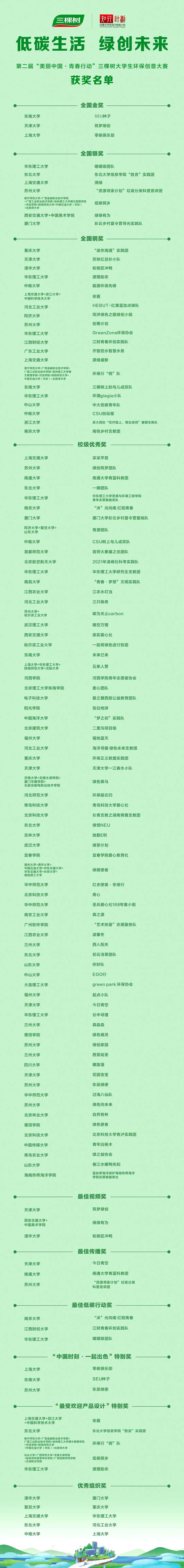 第二届“美丽中国·青春行动”三棵树大学生环保创意大赛至此落下帷幕,中国大学生知行促进计划秘书长夏军表示:愿未来有更多充满无限热情和蓬勃生机的青年人,怀揣“绿色低碳”理想加入加入我们,用青年力量,共建美丽中国,共创绿色未来。