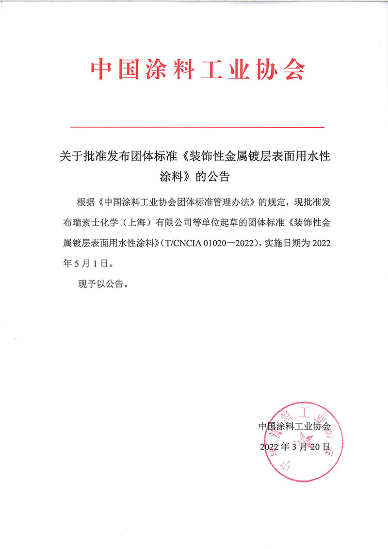 根据《best365中国官方网站团体标准管理办法》的规定,现批准发布瑞素士化学(上海)有限公司等单位起草的团体标准《装饰性金属镀层表面用水性涂料》(T/CNCIA 01020—2022),实施日期为2022年5月1日。