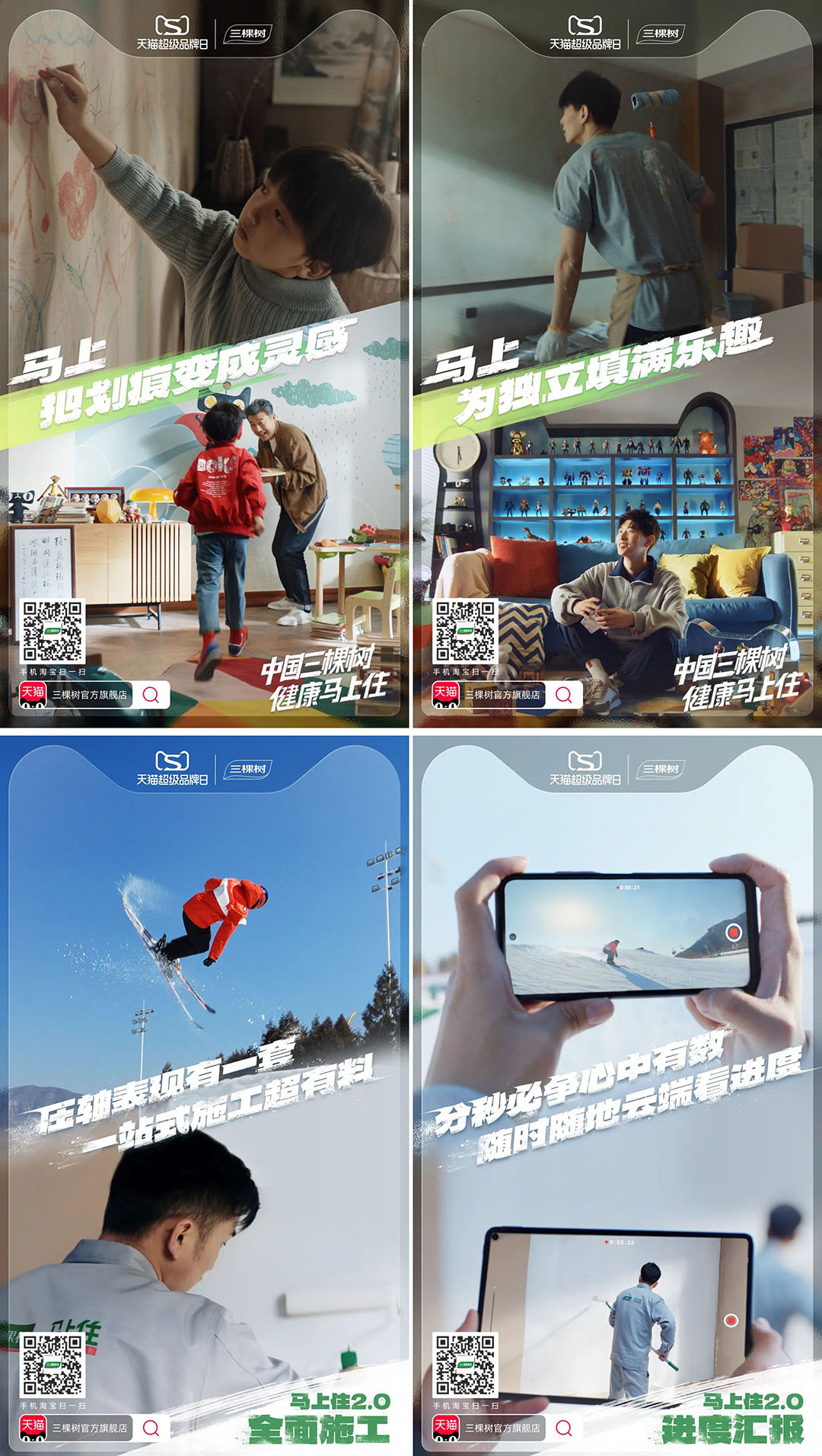在视频中,三棵树看到典型中国家庭的生活状态:三代同居的爷孙共同创造的空间;年轻夫妻幸福瞬间的定格;独立青年满载兴趣开启的未来。在叙事手法上,三棵树创新地将冬奥速度和马上住2.0服务相结合:马上住服务的每一个环节配合着分秒必争的雪场镜头,快节奏地展现出了三棵树对服务效率和质量的极致化追求。