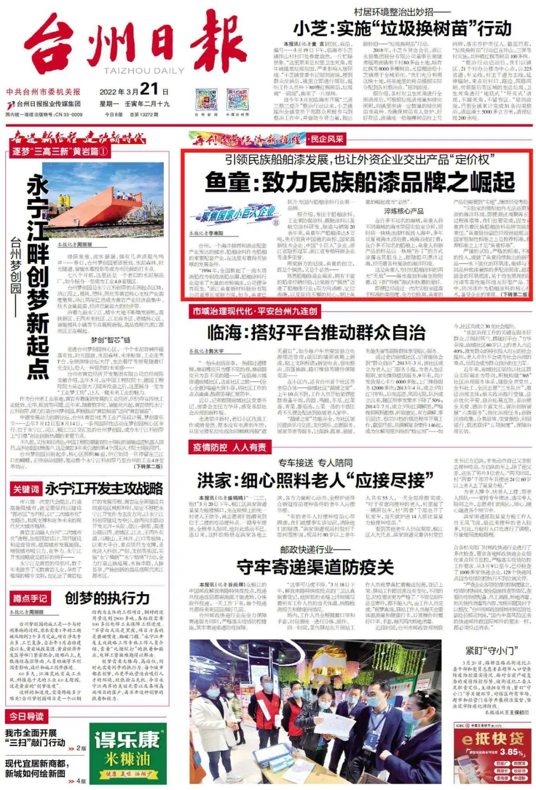 “1994年,全国掀起了一波木质渔船改为钢质渔船浪潮,船舶涂料行业迎来了大量的市场需求,公司便孕育而生。”浙江鱼童新材料股份有限公司董事长梁新方说,如今,鱼童已跃升为国内船舶涂料行业第一品牌。