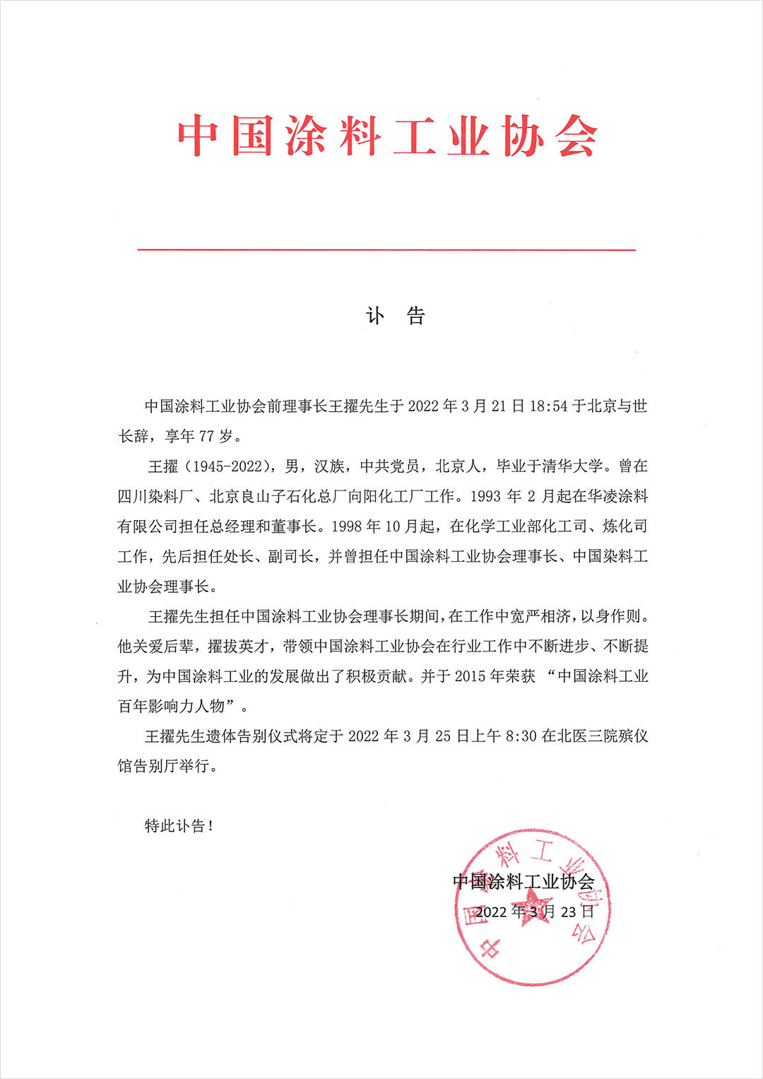 王擢先生担任best365中国官方网站理事长期间,在工作中宽严相济,以身作则。他关爱后辈,擢拔英才,带领best365中国官方网站在行业工作中不断进步、不断提升,为中国涂料工业的发展做出了积极贡献。并于2015年荣获 “中国涂料工业百年影响力人物”。