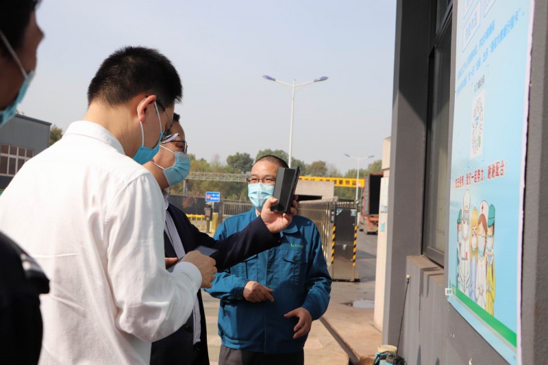 陈健主任一行在华源颜料董事长竺增林、总经理姚屹洋的陪同下来到公司,先在公司传达室进行扫码、测温,随后走进生产厂区实地查看疫情防控工作布署情况。