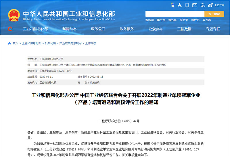 工业和信息化部、中国工业经济联合会近日联合印发通知,组织开展2022年制造业单项冠军企业(产品)培育遴选和复核评价工作。