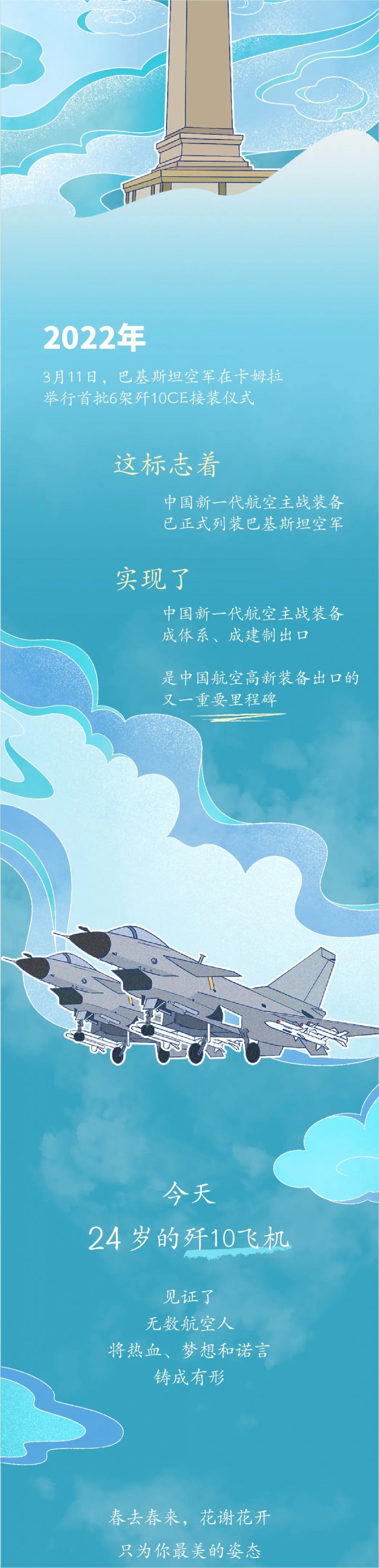 2022年3月23日,刚刚交付巴基斯坦空军的歼10CE首次亮相巴基斯坦国庆日阅兵,贡献了精彩的飞行表演。同时,还是歼10的生日,24年前,歼10直入云霄,首飞成功!作为空军新锐,承载了中国人民的无限期许。作为中国航空航天涂料领军企业,灯塔涂料为歼10提供各项指标优异的配套涂料,护航长空,壮志凌云。