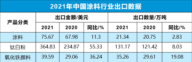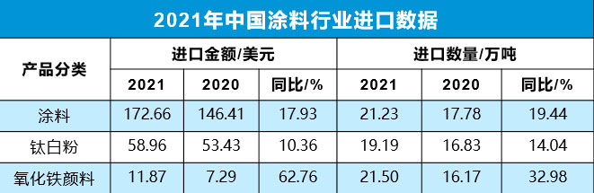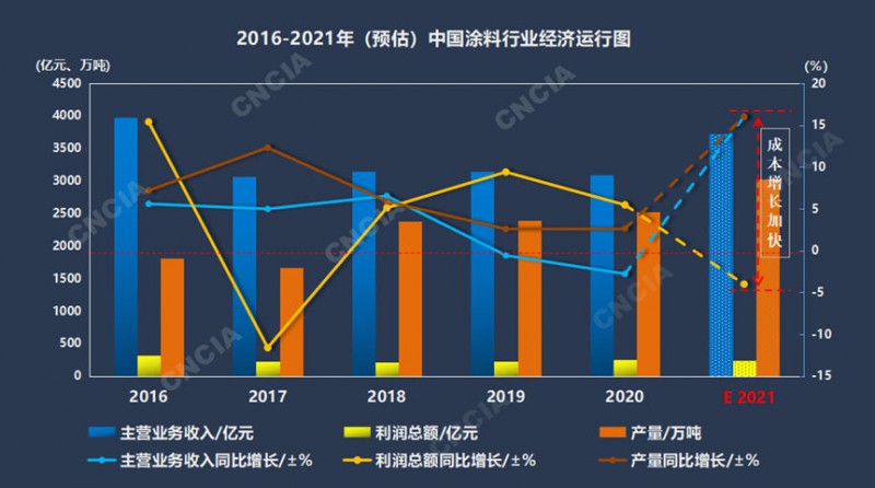 2021年,中国涂料行业完成产量3800万吨,同比增长16%;实现主营业务收入4600亿元,同比增长16%;实现利润303亿元,同比下降4%。