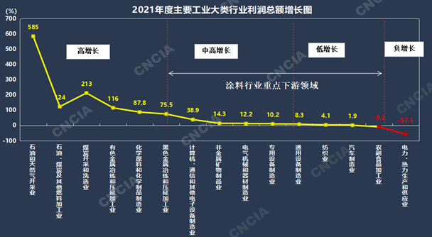 更严重的是利润总额曲线。从全国主要行业的利润情况可以看出来,上游原材料领域利润都非常高,越到下游的中间这部分,下游的制造业也就是涂料行业的重点用户,整个利润都是在降低的,这侧面影响了整个行业的消费和发展。