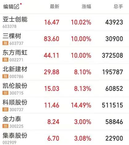 受此利好消息的影响,低迷已久的建材涂料板块今天终于迎来大爆发。其中涂料版块上市公司三棵树、亚士创能双双涨停。北新建材大涨8.1%,集泰股份、金力泰涨幅超过3%,防水行业龙头东方雨虹涨停,科顺股份大涨14.49%,凯轮股份大涨8.13%。此外,渝三峡A上涨1.47%,与涂料关联的双乐股份上涨1.2%,保立佳上涨0.93%。