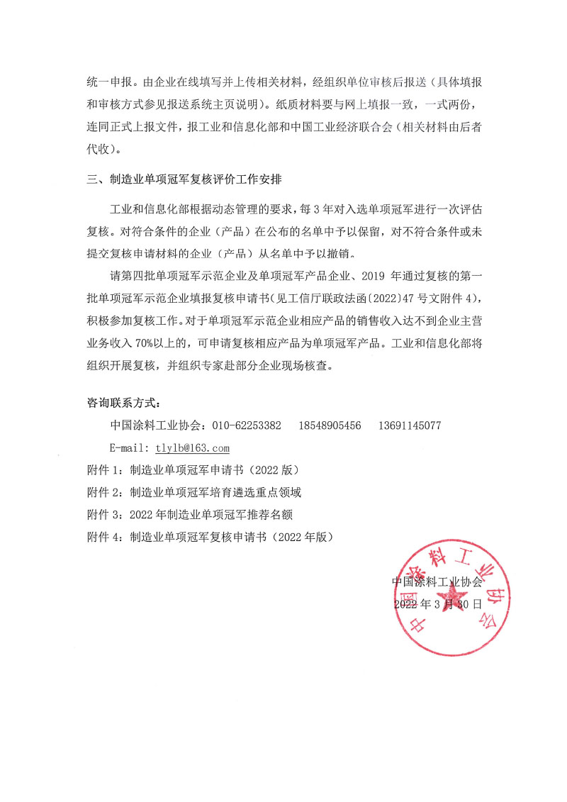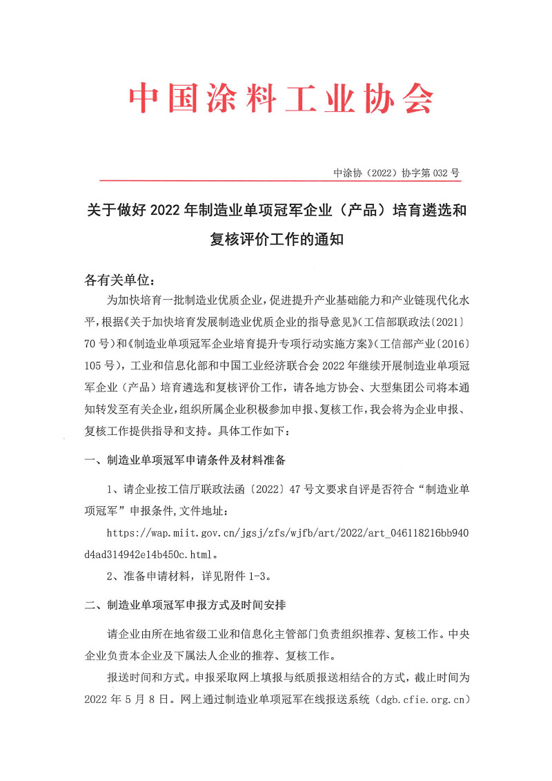 为加快培育一批制造业优质企业,促进提升产业基础能力和产业链现代化水平,根据《关于加快培育发展制造业优质企业的指导意见》(工信部联政法〔2021〕70号)和《制造业单项冠军企业培育提升专项行动实施方案》(工信部产业〔2016〕105号),工业和信息化部和中国工业经济联合会2022年继续开展制造业单项冠军企业(产品)培育遴选和复核评价工作,请各地方协会、大型集团公司将本通知转发至有关企业,组织所属企业积极参加申报、复核工作,我会将为企业申报、复核工作提供指导和支持。具体工作如下: