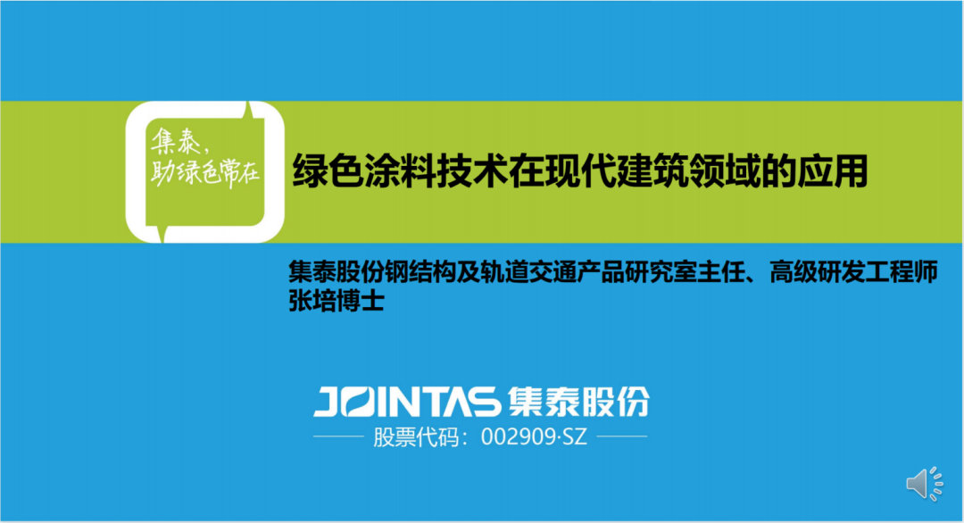 集泰股份钢结构及轨道交通产品研究室主任、高级研发工程师张培博士作《绿色涂料技术在现代建筑领域的应用》的主题分享。