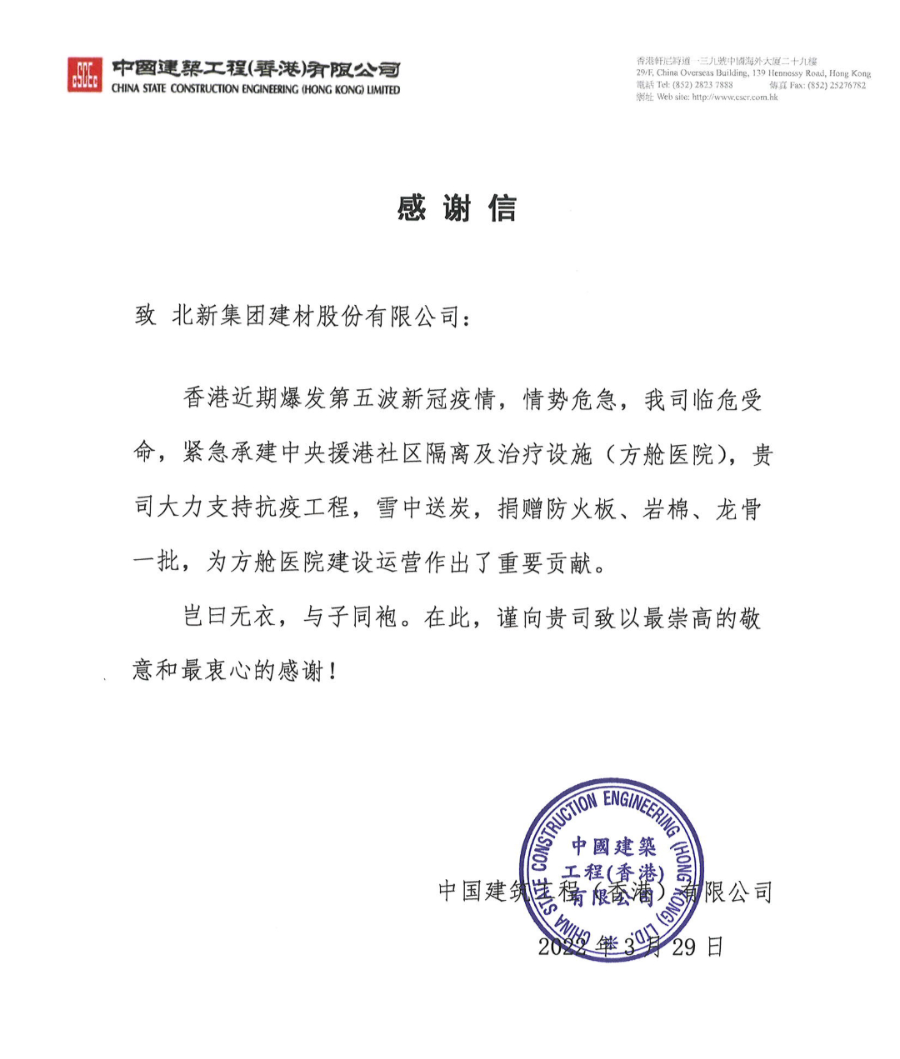 “疫情不灭,北新不退!”自3月17日起,北新建材为中央援建香港社区隔离设施项目提供15万平方米耐火石膏板、300余吨轻钢龙骨、450余吨岩棉等龙牌系列产品和解决方案,紧急驰援位于启德、竹篙湾的2个永久性社区隔离治疗设施和青衣、新田、港珠澳大桥香港口岸、粉岭、洪水桥、元朗6个临时性社区隔离设施项目建设,为中央援港社区隔离及治疗设施项目建设提供大力支持。中国建筑工程(香港)有限公司给北新建材发来感谢信,感谢北新建材大力支持抗疫工程,为中央援港社区隔离及治疗设施建设运营作出了重要贡献。