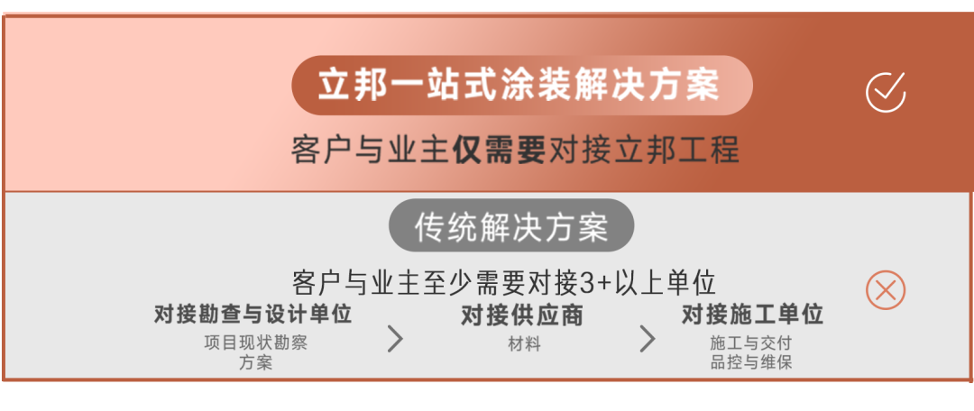 面对旧改工程完整呈现的难点和客户沟通消耗的痛点,立邦提出城市更新改造一站式涂装解决方案,全流程参与解决传统旧改工程可能出现的诸多问题,让客户统一对接立邦即可掌握工程进展,并保证成本把控、产品供应及设计协调等一系列细节问题有序可控。