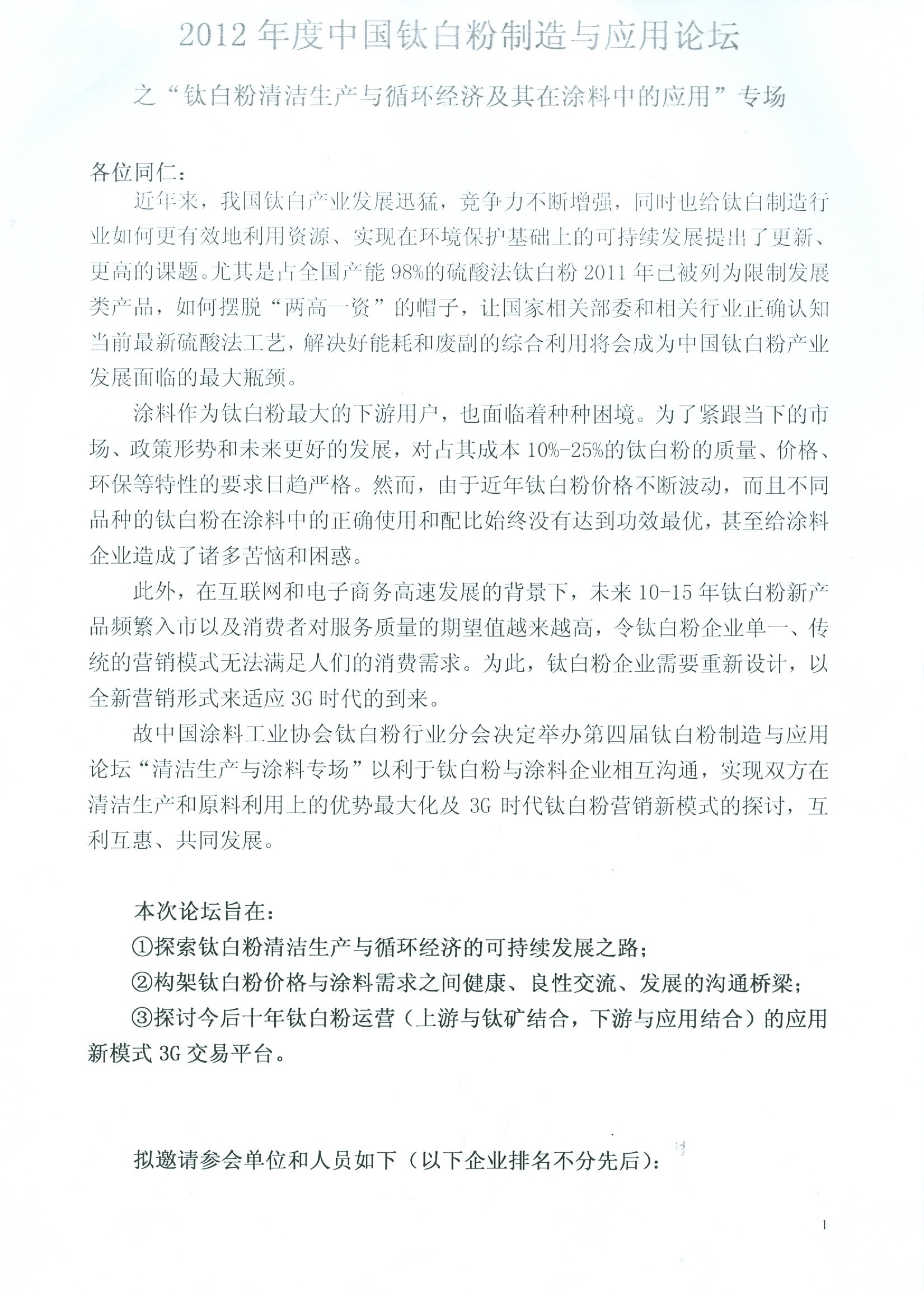 【本次论坛分3个板块:钛白粉清洁生产与循环经济板块;下游应用板块(钛白粉在涂料中的应用);3G时代最新营销模式板块。】
