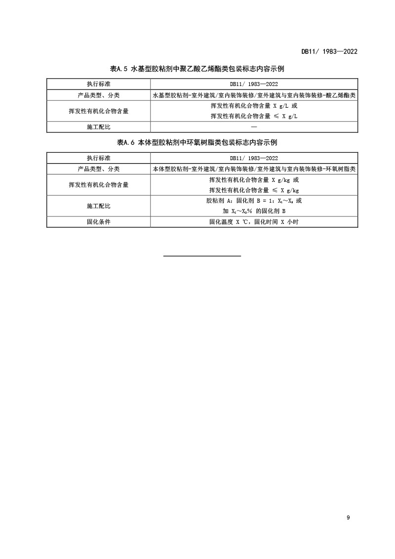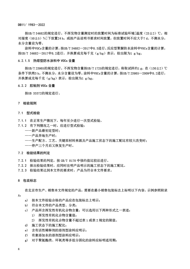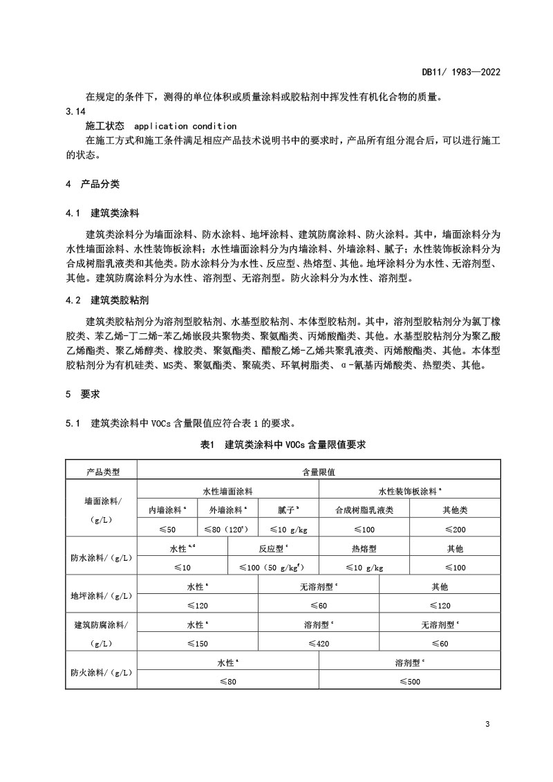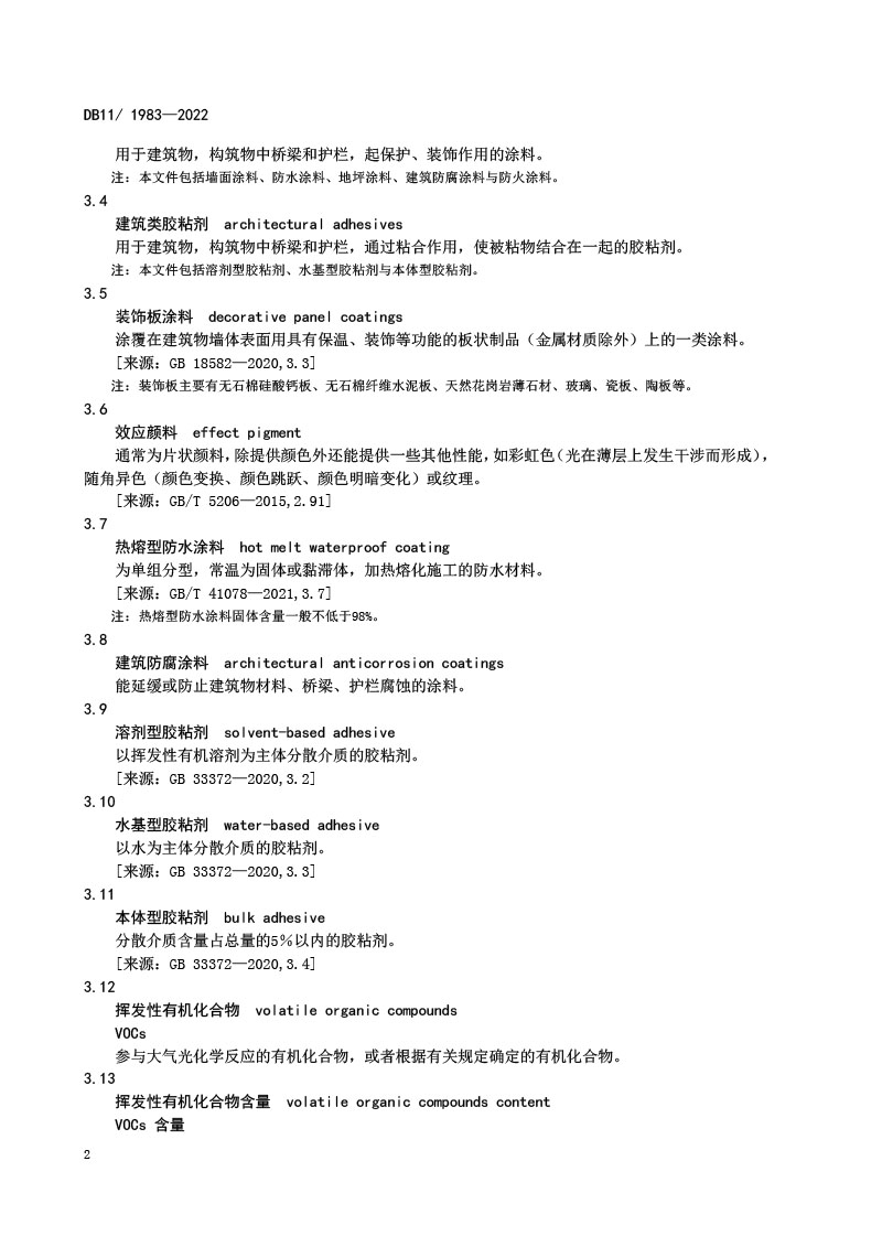 此标准代替DB11/ 3005-2017《建筑类涂料与胶粘剂挥发性有机化合物含量限值标准》,DB11/ 3005-2017自本标准实施之日起废止。与DB11/ 3005-2017相比,除结构调整和编辑性修改外,主要技术变化如下:更改了文件的范围;删除了规范性引用文件“GB 24408-2009、GB 18582-2008、GB/T 22374-2008、GB 30981-2014、GB 18583-2008、JC 1066-2008”;增加了规范性引用文件“GB/T 1725、GB/T 20740、GB 18582-2020、GB/T 23985-2009、GB33372、GB/T 34682-2017”;更改了“建筑类涂料”“建筑类胶粘剂”“挥发性有机化合物”“挥发性有机化合物含量”的定义;删除了“重防腐涂料”的术语和定义;增加了“建筑物”“构筑物”“装饰板涂料”“效应颜料”“热熔型防水涂料”“建筑防腐涂料”“溶剂型胶粘剂”“水基型胶粘剂”“本体型胶粘剂”“施工状态”的术语和定义;增加了产品分类;外墙涂料“面漆”和“底漆”合并为“外墙涂料”,内墙涂料“面漆”和“底漆”合并为“内墙涂料”,更改了 VOCs 含量限值;增加了“水性装饰板涂料”的 VOCs 含量限值;“挥发固化型防水涂料”改为“水性防水涂料”,“反应固化型防水涂料”改为“反应型防水涂料”;增加了“热熔型防水涂料”和“其他”的 VOCs 含量限值;删除了“溶剂型地坪涂料”的 VOCs 含量限值;增加了“其他”的 VOCs 含量限值;增加了“无溶剂型建筑防腐涂料”的 VOCs 含量限值;增加了“防火涂料”的 VOCs 含量限值;按不同应用领域,更改、增加了胶粘剂的品种及其 VOCs 含量限值;更改了测试方法;更改了检验规则的内容;更改了包装标志的内容;增加了标准的实施。