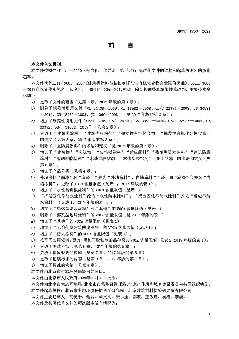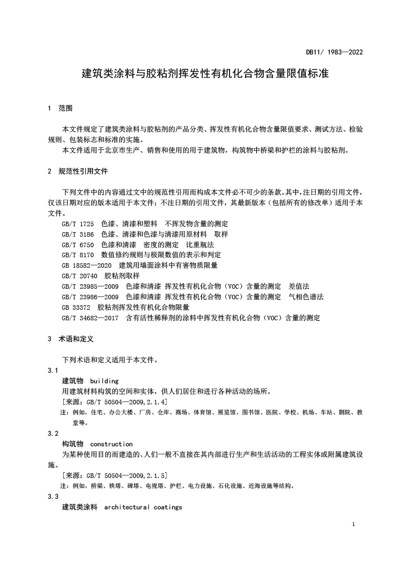 近日,从北京市生态环境局获悉,北京市地方标准《建筑类涂料与胶粘剂挥发性有机化合物含量限值标准》(DB11/ 1983-2022)于2022年4月1日发布,并于2022年10月1日开始实施。