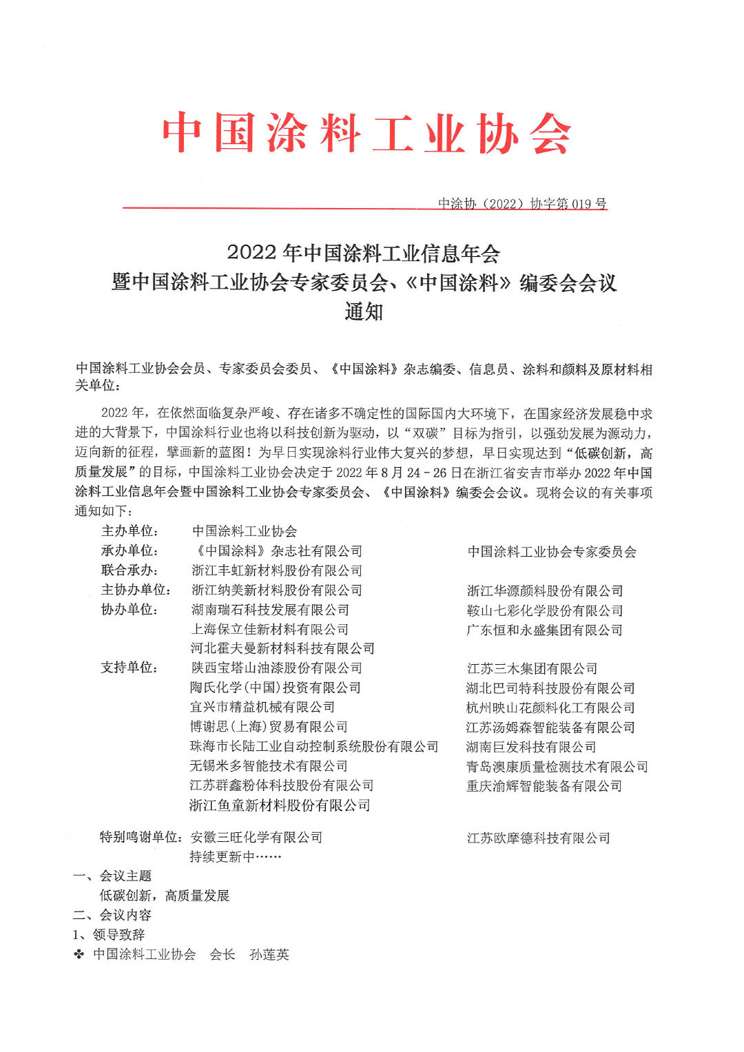 2022年,在依然面临复杂严峻、存在诸多不确定性的国际国内大环境下,在国家经济发展稳中求进的大背景下,中国涂料行业也将以科技创新为驱动,以“双碳”目标为指引,以强劲发展为源动力,迈向新的征程,擘画新的蓝图!为早日实现涂料行业伟大复兴的梦想,早日实现达到“低碳创新,高质量发展”的目标,best365中国官方网站决定于2022年8月24–26日在浙江省安吉市举办2022年中国涂料工业信息年会暨best365中国官方网站专家委员会、《中国涂料》编委会会议。现将会议的有关事项通知如下: