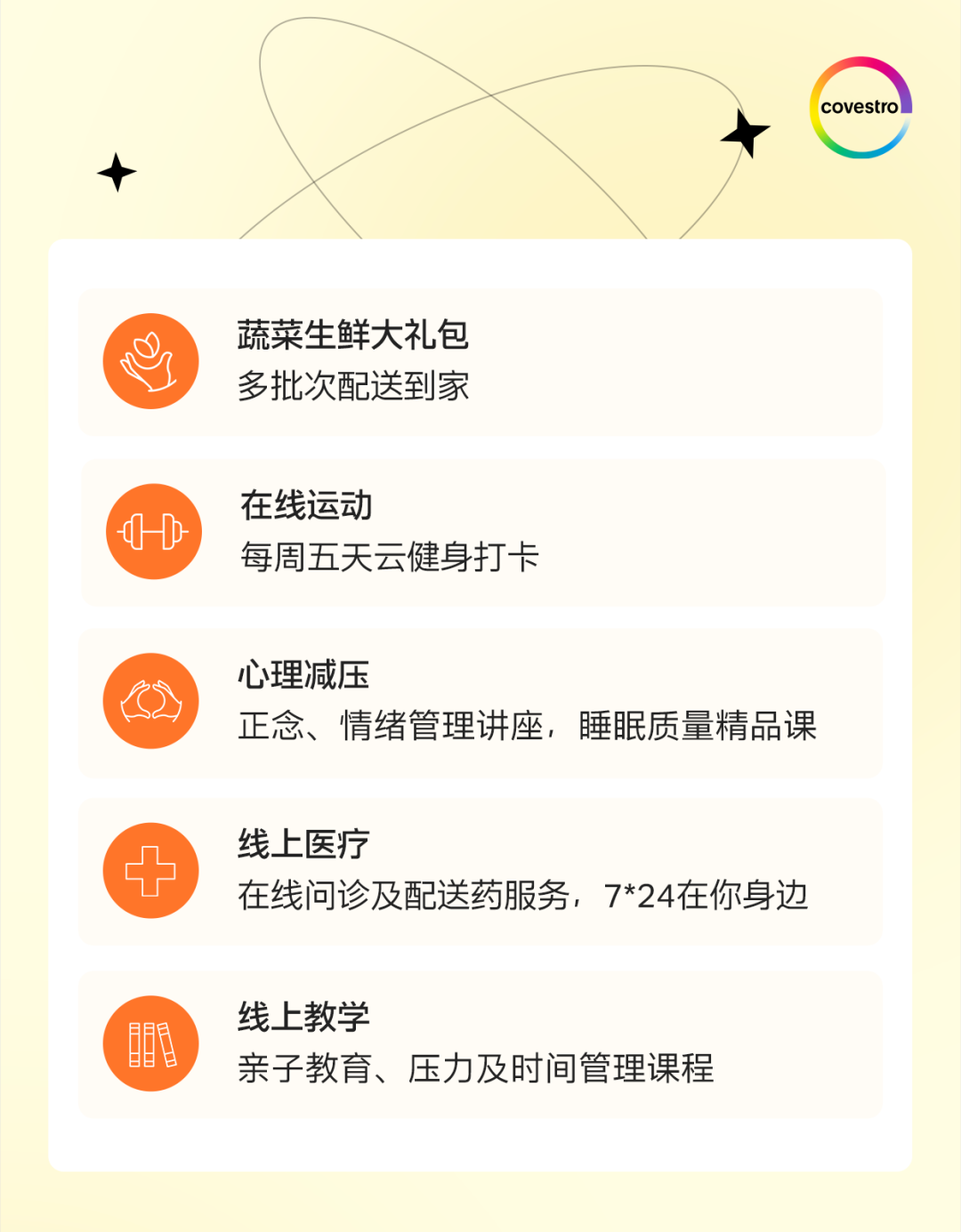 对于封控在家工作的同事们来说,物资的紧缺和心态的调整是不小的挑战。科思创中国管理团队、中国危机管理团队以及科家工会迅速响应,急员工所急,想员工所想,通过发放蔬菜生鲜大礼包等举措,为科家人铸就了坚强的后盾。