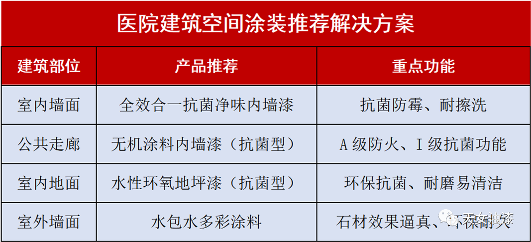 针对医疗机构有可能被病原微生物污染的区域或被病人直接接触和间接接触的区域,如病房、观察室、接待室、治疗室等场所,需要采用具有抗菌防霉功能的墙面涂料,降低交叉感染或阻断细菌传播渠道。