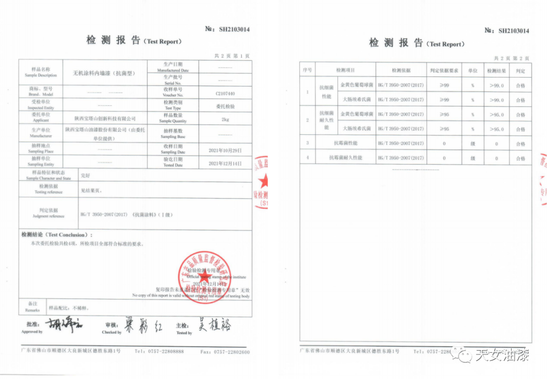 该产品符合行业标准HG/T 3950-2007《抗菌涂料》(I级)的标准要求。