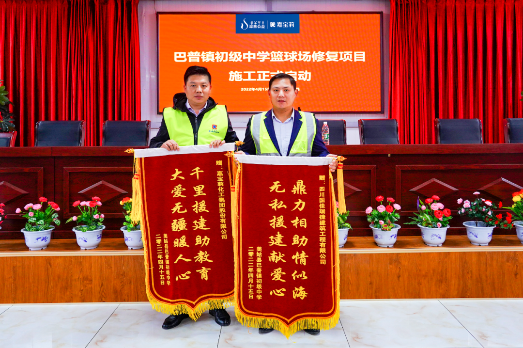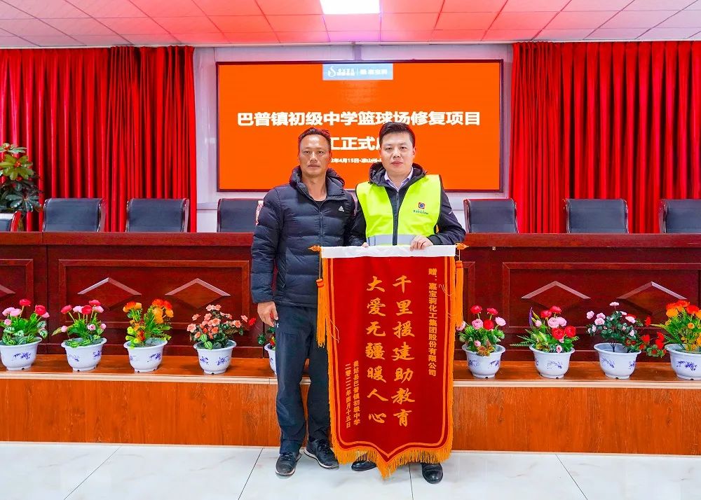 会议尾声,巴普中学校长乌尔中田为嘉宝莉及国佳瑞捷授旗,对他们的支持及协助以表感谢,同时亦标志着巴普镇初级中学篮球场修复项目施工正式启动!