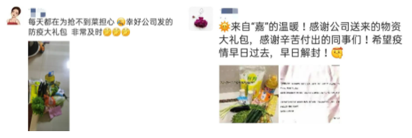 关爱大礼包在上海各区穿梭,送到了在封闭小区的员工手上,让他们感受到“嘉”的速度与温暖。许多“嘉”人刷屏写下感言。