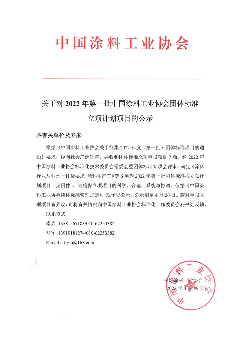 根据《best365中国官方网站关于征集2022年度(第一批)团体标准项目的通知》要求,经向社会广泛征集,共收到团体标准立项申报项目7项。经2022年best365中国官方网站标准化技术委员会常委会暨团体标准立项会评审,确定《涂料行业从业水平评价要求 涂料生产工》等6项为2022年第一批团体标准拟立项计划项目(见附件)。为确保立项项目的科学、合理、系统与协调,依据《best365中国官方网站团体标准管理规定》,现予以公示,公示期至4月26日。若对申报立项项目有异议,可将有关情况向best365中国官方网站标准化工作委员会秘书处反馈。